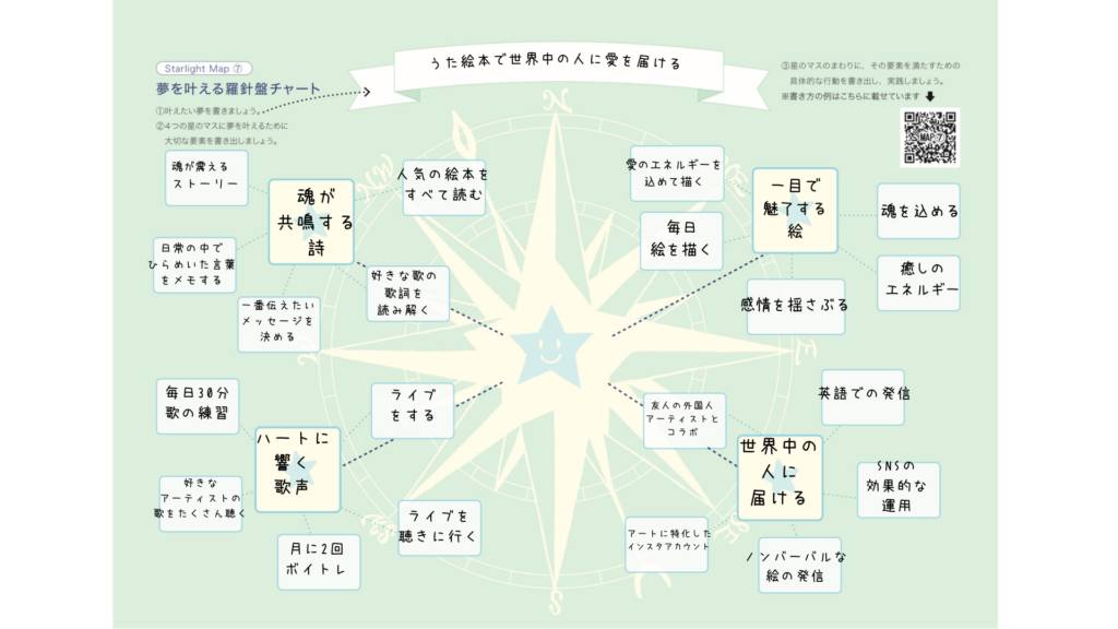 Starlight Map⑦の解説です。 まずは、一番上のリボンの枠に、あなたが叶えたい夢を書き出しましょう。星の描かれた枠にその夢を叶えるための4つの要素を書き出します。 周りの枠には、その要素を叶えるための具体的な行…